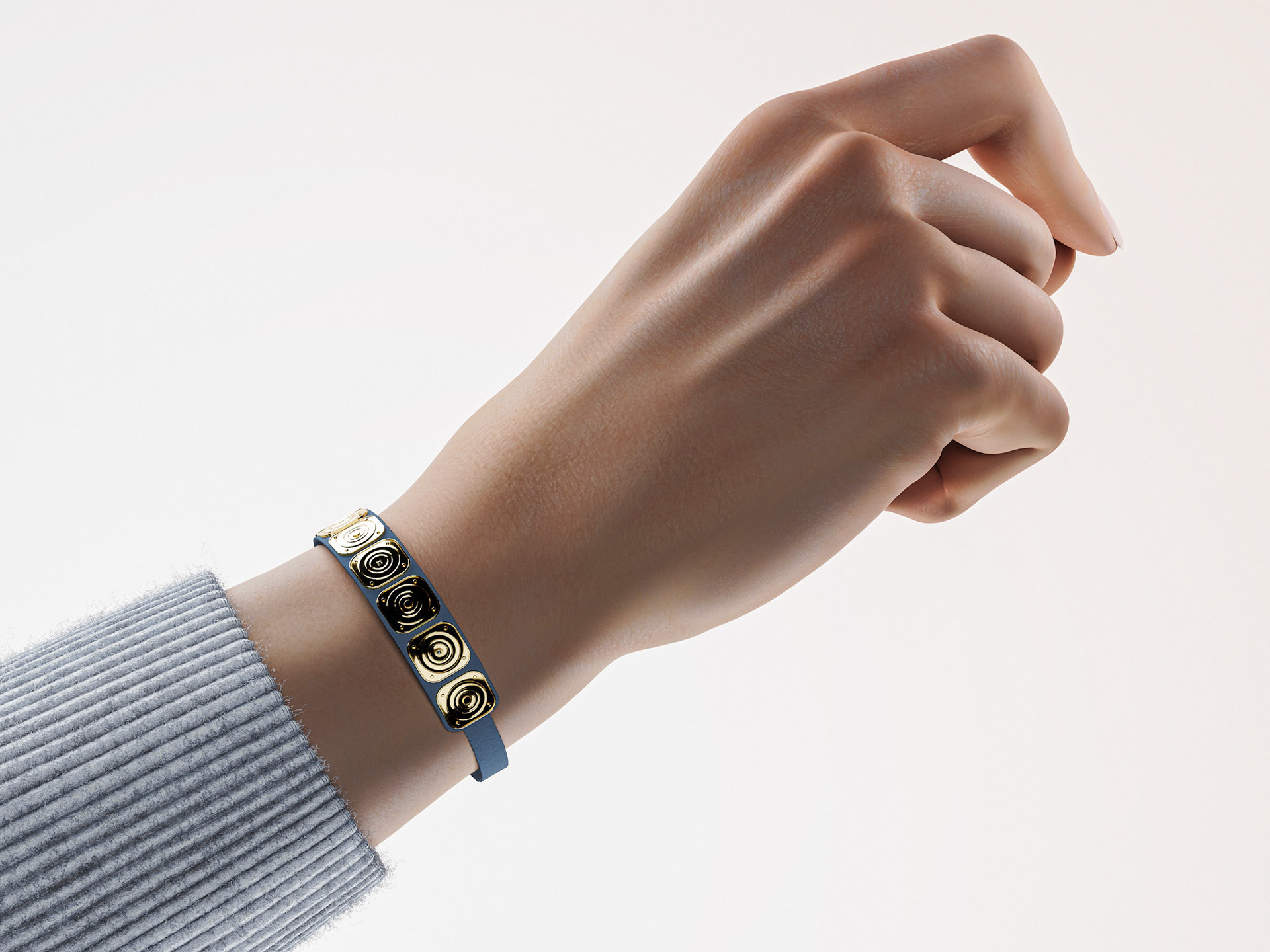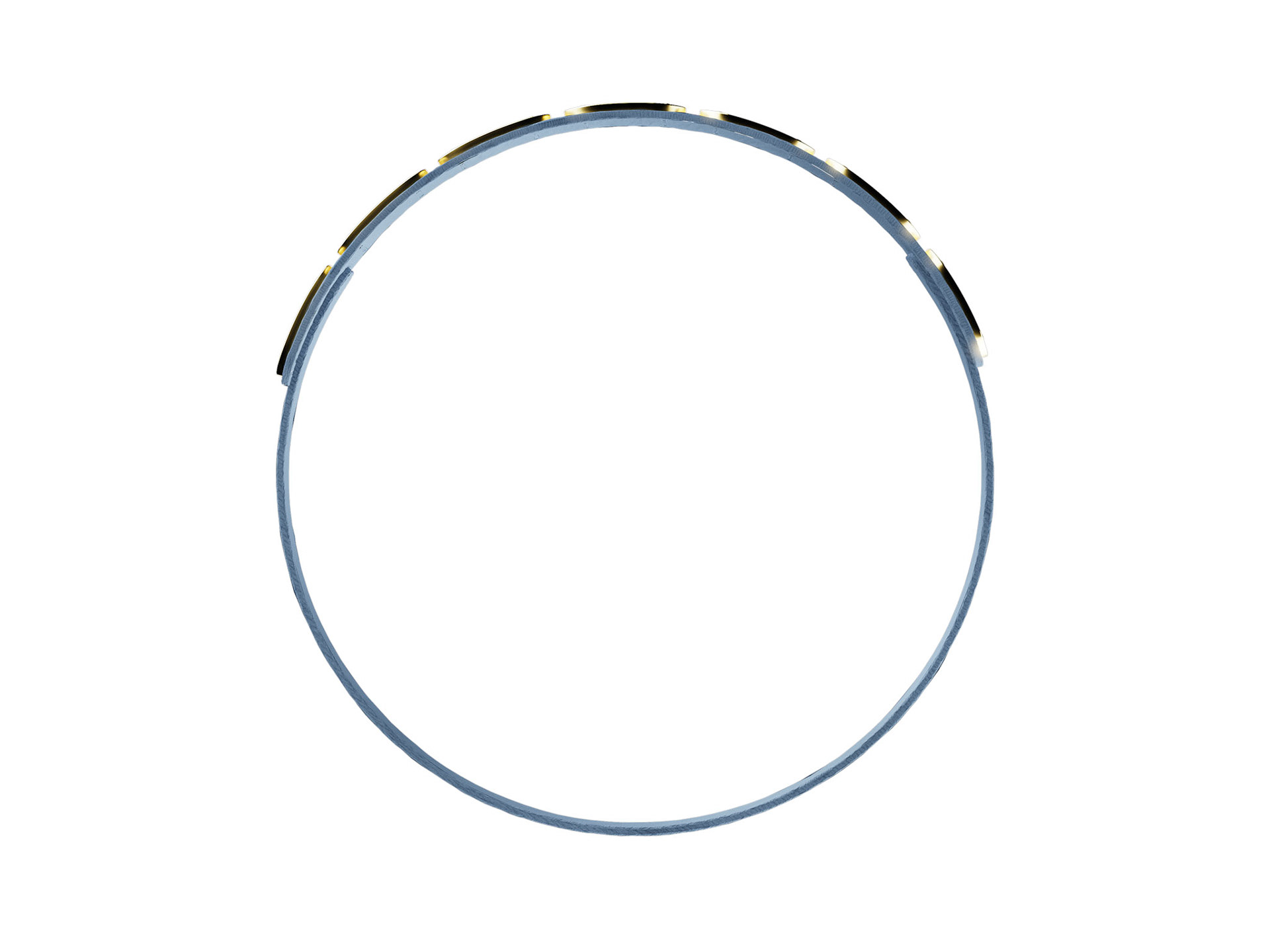 Pour ce bracelet, j’ai réinterprété les plaques du cingulum en une série de modules alternant éléments métalliques et pierres serties. J’ai choisi le saphir pour cette version, mais le design se prête à toutes les pierres, selon les goûts ou l’histoire que l’on souhaite raconter.