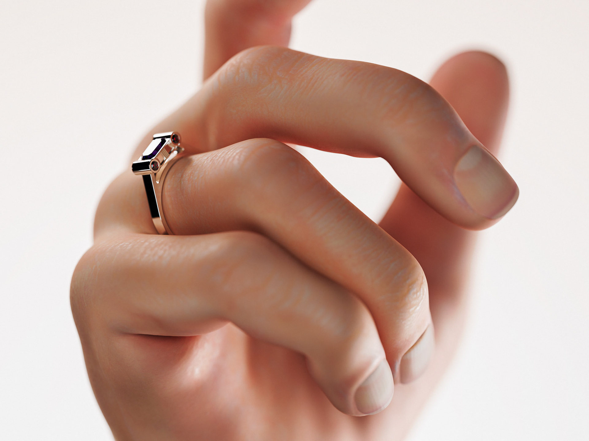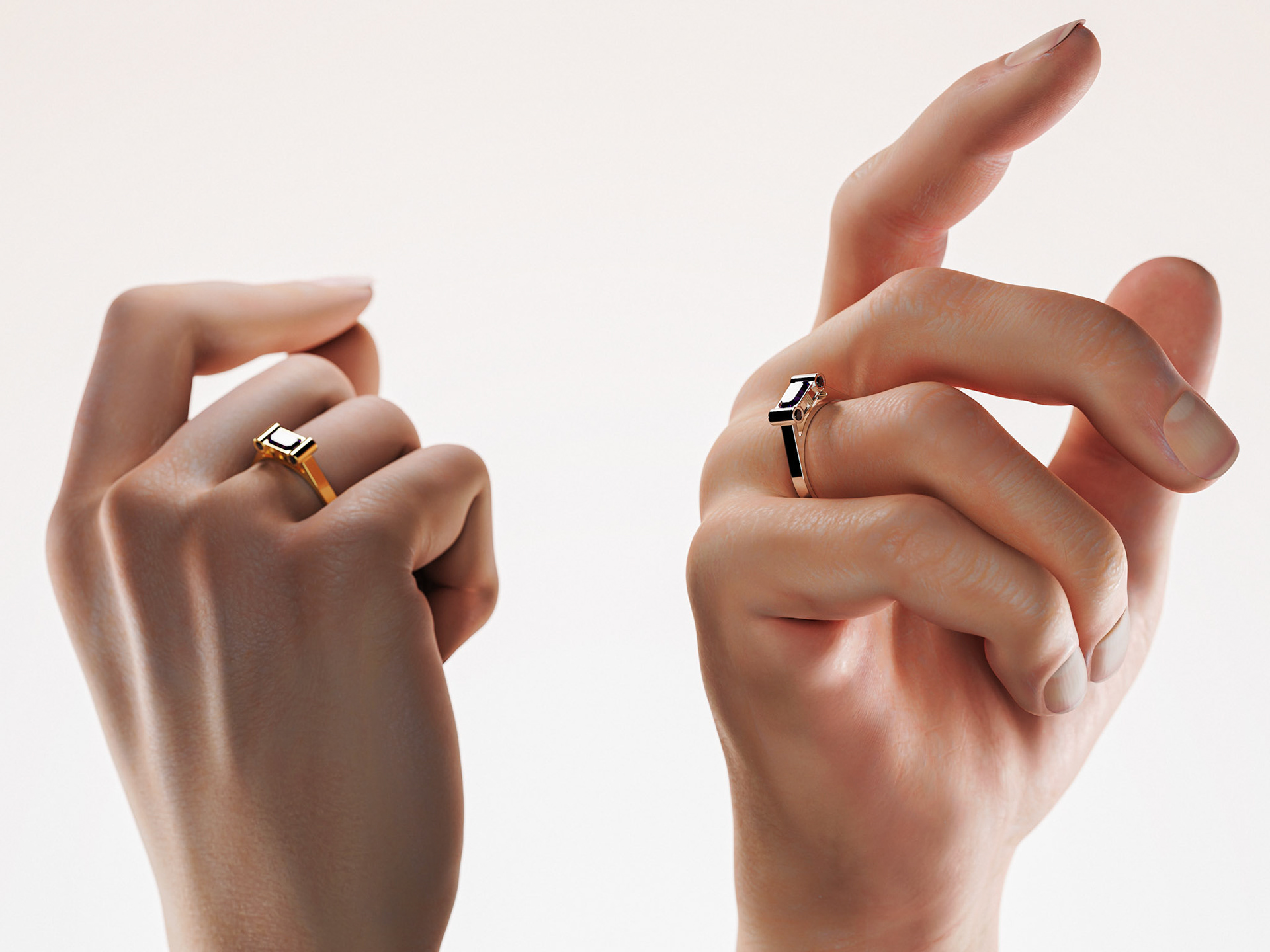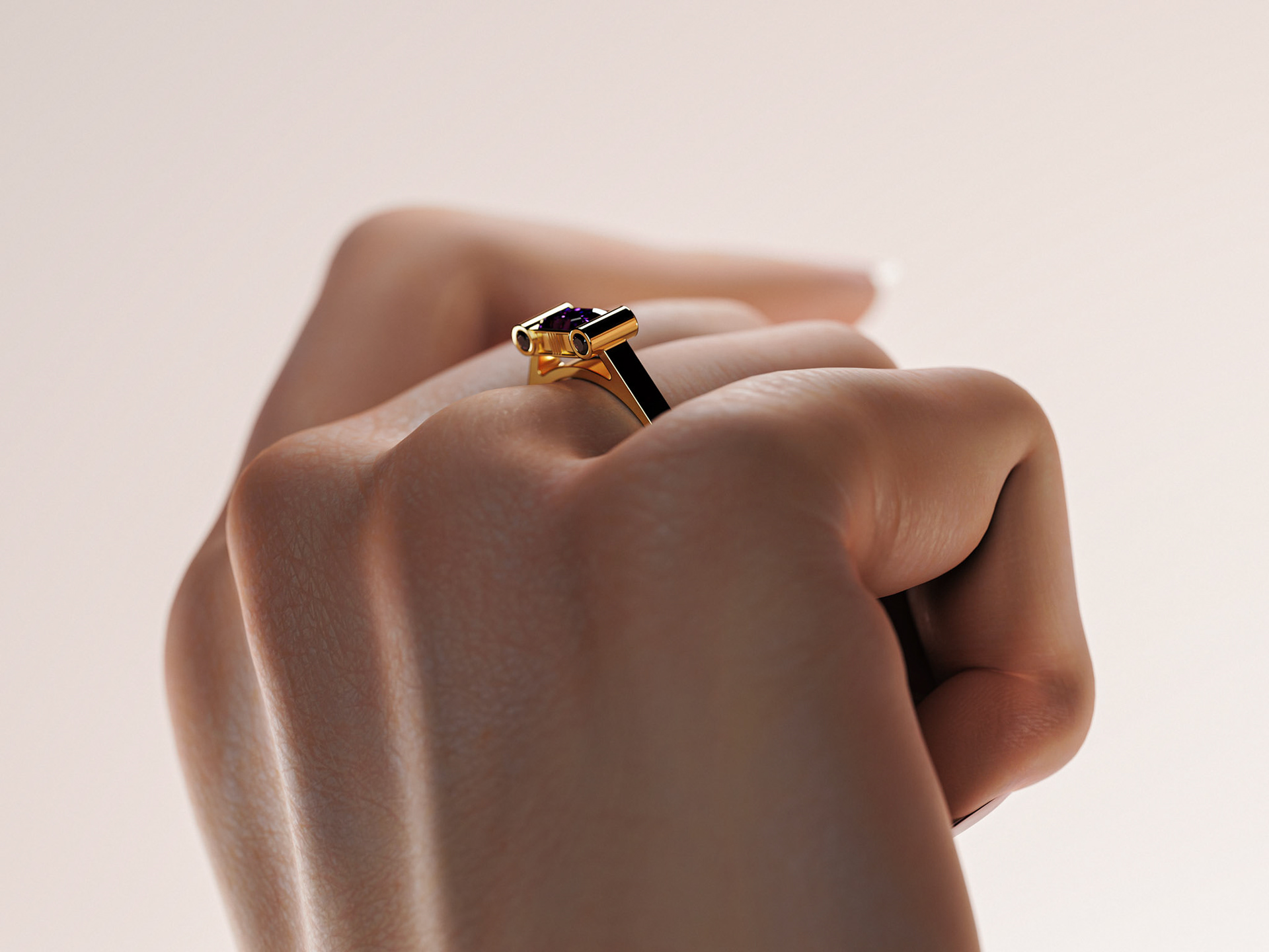 Voici IONA II, la toute première bague à être produite pour le studio. Cette version est maintenant à 95 % du modèle final, ce qui signifie que les proportions sont bien plus précises par rapport à notre première itération.Nous avons hâte de vous fournir davantage d'informations à ce sujet très prochainement. Cette magnifique bague est conçue en or jaune et est ornée de quatre diamants brillants de 2,50 mm chacun, ainsi que d'une pierre centrale mesurant 6x4 mm.