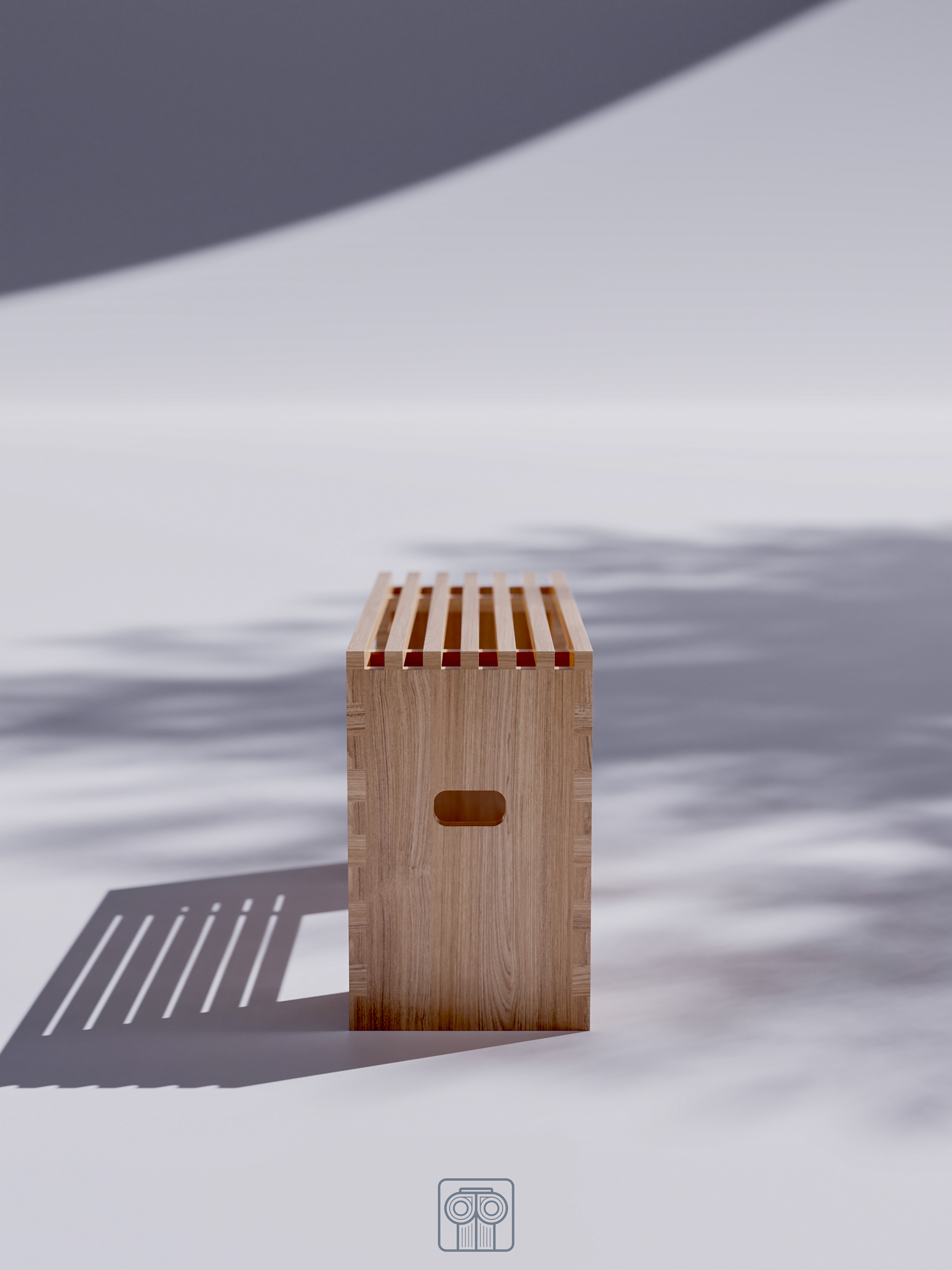 The purpose of this exercise was to create a furniture collection for Le Corbusier's cabin, where he lived until his death in 1965, while incorporating his design principles. I made slight adjustments to the concept by replacing the solid seat surface with slats, evoking an Asian ambiance. I also reinforced the legs with two braces. Ideally, it would be made of beech wood.